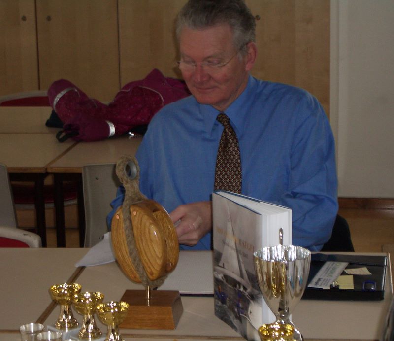070324 RB111 årsmöte -- Sekreterare Hans Eriksson sorterar dokumenten inför årsmötesförhandlingarna